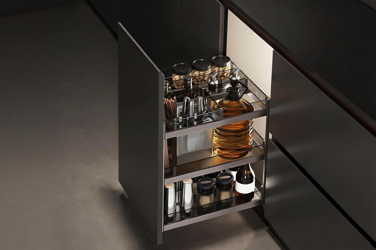 In compact kitchens, multi-functional pull-out organizers help combine storage needs without overcrowding. Using adjustable tiers and soft-close slides keeps things neat and easy to use.